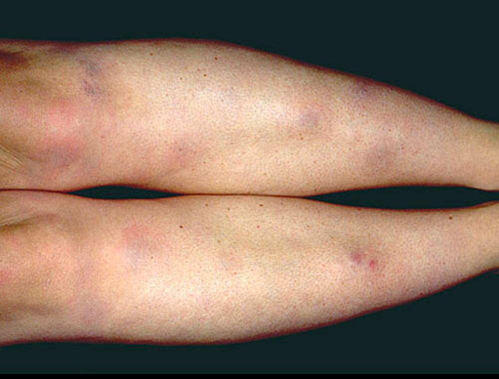 Главный признак спонтанного панникулита – узловые образования, располагающиеся в подкожно-жировой клетчатке на разной глубине. Чаще всего они располагаются на ногах, руках, реже – в области живота и груди. После исчезновения узлов в местах их локализации отмечаются очаги атрофии подкожно-жировой клетчатки. Размер узелков обычно достигает 3-5 см. Кожа вокруг узлов может быть слегка покрасневшая либо не изменена.